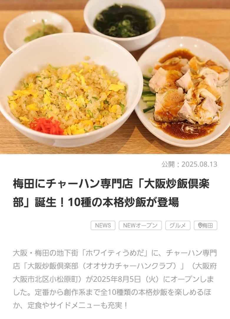 中華料理 #炒飯 #チャーハン チャーハン好き必見!「大阪炒飯倶楽部」が神すぎる件www #炒飯 #チャーハン 2026年2月4日 2026年2月4日 gourmetdesu22 Facebook postはてブLINEPocketFeedly 「大阪炒飯倶楽部」の登場は、炒飯ファンにはたまらないサプライズです。梅田の中心に位置しつつ、アットホームな雰囲気も漂っています。各種炒飯の自家製ソースやトッピングのこだわりが感じられ、何度でも通いたくなる魅力満載です。お腹が空いたら、ぜひこちらで本格的な炒飯を味わいに来てください。#チャーハン #炒飯 <関連する記事> 【大阪府大阪市】本気チャーハンが主役の専門店「大阪炒飯倶楽部」が梅田にオープン - STRAIGHT PRESS (出典:STRAIGHT PRESS) 梅田にチャーハン専門店「大阪炒飯倶楽部」誕生!10種の本格炒飯が登場 - PrettyOnline (出典:PrettyOnline) 唯一無二の“10種の本格炒飯”が味わえる! “炒飯好きの楽園”「大阪炒飯倶楽部」がホワイティうめだに登場! - PR TIMES (出典:PR TIMES) ホワイティうめだにチャーハン専門店「大阪炒飯倶楽部」 連日300人来店 - 梅田経済新聞 (出典:梅田経済新聞) <関連する画像> (出典 食べログ) (出典 ストレートプレス) (出典 ガジェット通信 GetNews) (出典 ガジェット通信 GetNews) (出典 ストレートプレス) (出典 食べログ) (出典 水野真紀の魔法のレストラン - MBS 毎日放送) (出典 食べログ) (出典 ガジェット通信 GetNews) (出典 Retty(レッティ)) (出典 食べログ) (出典 ameblo.jp) <関連する動画> \梅田で話題の行列店/チャーハン専門店『大阪炒飯倶楽部』 - YouTube <ツイッターの反応> ピックアップ記事 広告 Facebook postはてブLINEPocketFeedly
