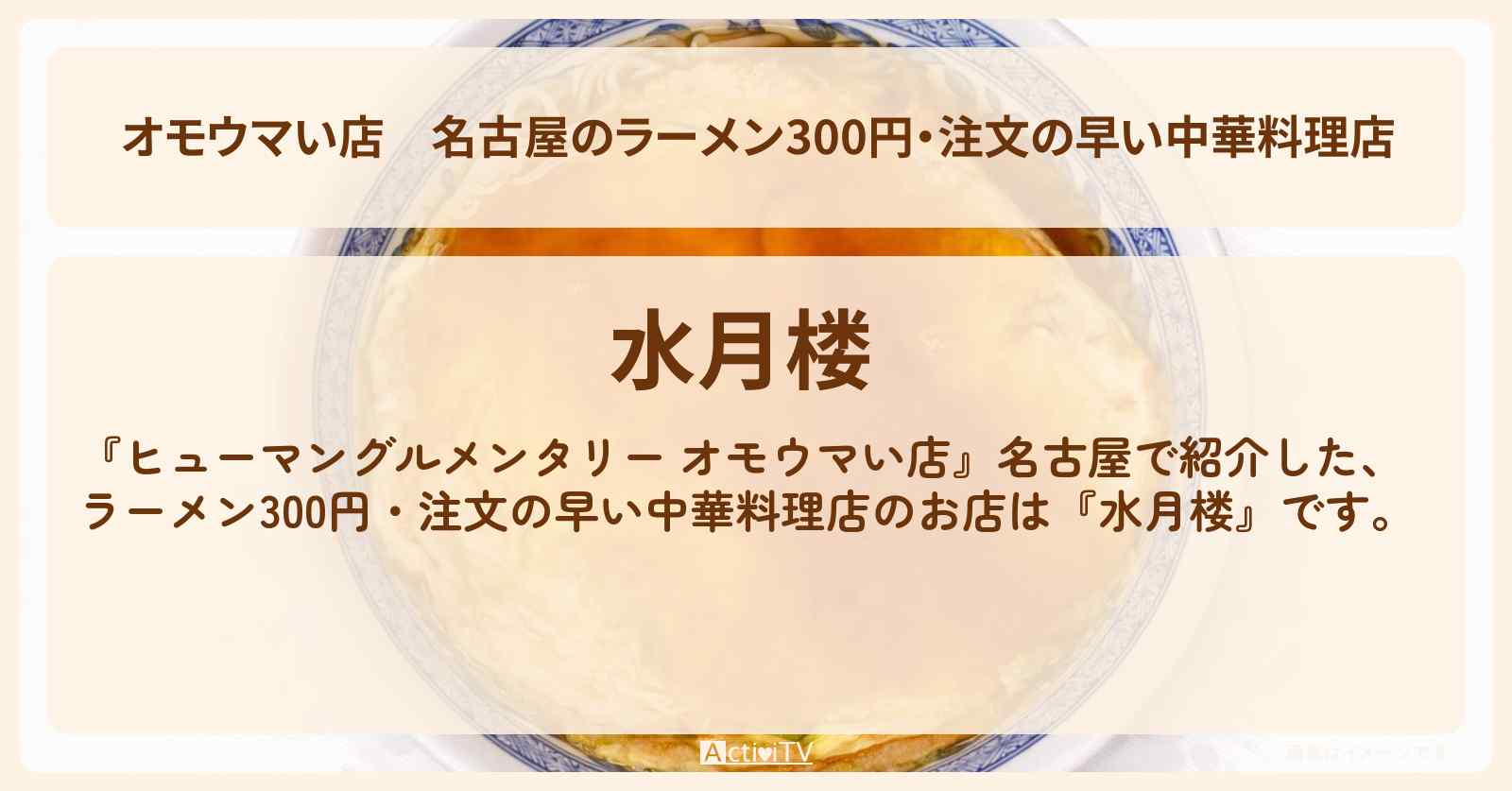 名古屋の「水月楼」で味わったラーメン300円には本当にびっくりしました!ボリュームもあり、満足感は抜群。一人で二品頼むと再度の割引が受けられるので、友達とシェアしても楽しめるのが魅力的です。ぜひ、地元の方も観光客も足を運んで欲しいお店です!名古屋市に訪れた際は是非ともチェックして下さい #ラーメン #中華料理